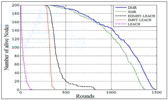 Figure 11 shows the relationship between the number of living nodes versus the rounds. It can be seen that the two techniques, SMR and DMR, have achieved a moderated decline in the number of nodes that die versus the rounds in comparison with a very rapid decline presented by other protocols. Hence, the results revealed that the energy dissipation has been gradually reduced by the proposed approaches with a preference for the DMR technique. It should be noted that the main reasons for this result are related to the features of the proposed approaches that have been mentioned previously in this section.