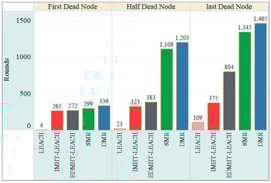 In Figure 12, the stability of the network, which refers to the first, half and last dead node versus the number of rounds, has been represented for the same set of protocols. Once again, the proposed techniques have achieved the best results compared with the others. Furthermore, the DMR technique has achieved the best result compared with the SMR approach. Here, the moderate receding in the energy of nodes, which is achieved by using the proposed approaches, has contributed in improving the stability of the sensor network. Consequently, the performance of the WSN will significantly increase by using the proposed approaches. On the other side, the dynamic approach, which is based on changing the routes of the data to the BS and the CHs within the same round, has appreciably reduced the energy receding in the sensors network compared with SMR protocol. Accordingly, the DMR protocol enhanced the stability of the sensor network.