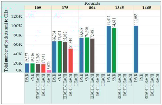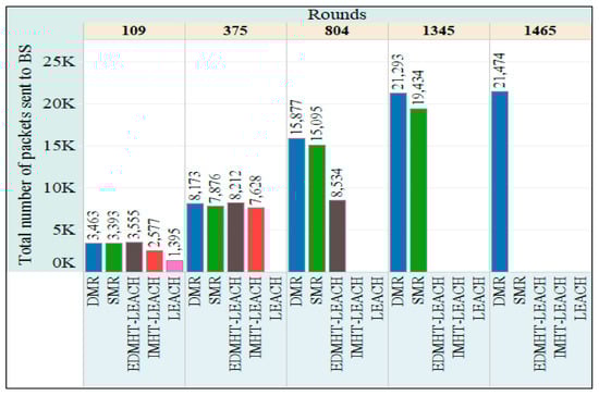In Figure 14, the total number of packets sent to the BS per rounds is represented. Once more, the SMR and DMR techniques have achieved the best results. The DMR technique outperformed the SMR technique. Once again, improving the lifetime and the stability of the network, which were achieved by using the proposed approaches, plays a key role in increasing the total number of packets sent to the BS. Consequently, the total number of packets, which were sent to the BS from the CHs and the INs, has risen up.