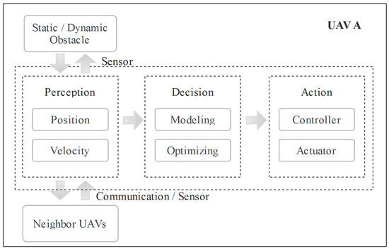 In general, the problem of swarm coverage is simplified to the process of designing a distributed algorithm for the individual UAV to cooperate with other UAVs. The general procedure of each UAV can be simply divided into three aspects—perception, decision and action—as shown in Figure 1. The first part is acquiring the information, such as position and velocity, via sensors or communication, which includes an UAV’s own information and that of other UAVs on factors such as static/dynamic obstacles and neighboring UAVs. The second part is the decision, which can be divided into two subparts: modeling and optimizing. Finally, the optimal decision will be executed by the actuator. The process is continuously repeated.