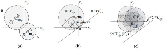 The visual display of UAVs and , and the weak coverage velocity . (a) Display of two UAVs and in configuration space; (b) Visualization of and weak coverage velocity set in velocity space; (c) Minkowski sum sets owing to the fluctuation of UAV ’s velocity.