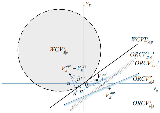 The ORCV described by the RD method as noted above satisfies the constraints of avoiding collision with other UAVs, as will be proved as below.