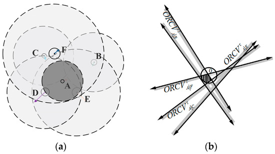 The construction of optimal velocity space. (a) Visual display of UAVs’ situation; (b) The geometrical expression of .