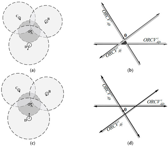 Clearly, the set for is defined symmetrically. Moreover, the above method is applicable when , which indicates that and will not lead to the weak coverage if they still adopt their current velocities and , respectively. However, in this situation, both UAVs can also utilize the abovementioned method to maintain a coverage-beneficial movement.
