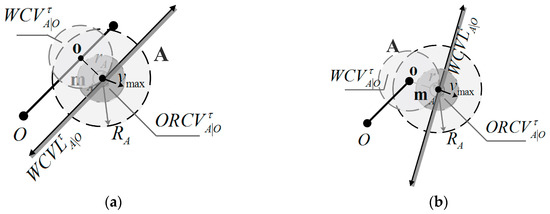 When the distance between UAV and obstacle is less than a constant , UAV should consider the obstacle . If allowing UAVs not to be sensitive to the obstacle, then can be less than coverage-radius . Otherwise, should be equal to . If UAV ’s velocity is within , then the weak coverage during the time interval is appeared relative to obstacle . is defined for the optimal velocity to realize the coverage-beneficial motion relative to obstacle , which is the intersection of and . is determined by selected point in segment , which is the weakest coverage point, as shown in Figure 7a,b.