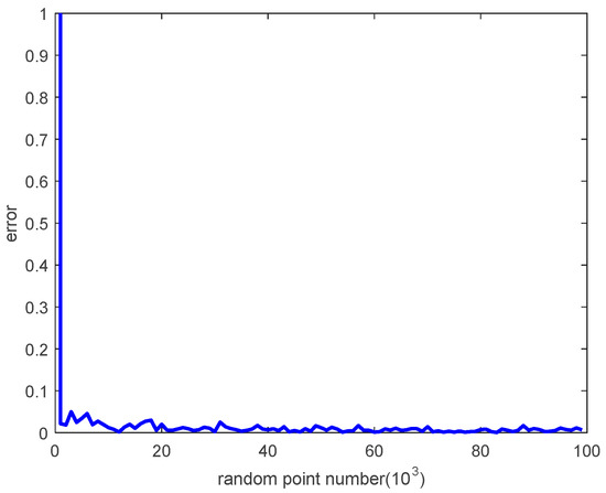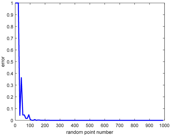 The error nearly reaches zero after 200 random points, which confirms the validity of the proposed technique to evaluate the null set when the number of random point is set to 1000.