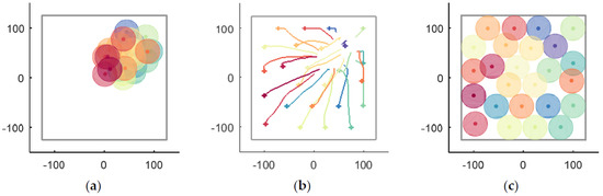 The entire process of UAVs’ coverage in a closed environment without obstacles. (a) the initial positions; (b) the moving trajectories; (c) the optimal coverage.