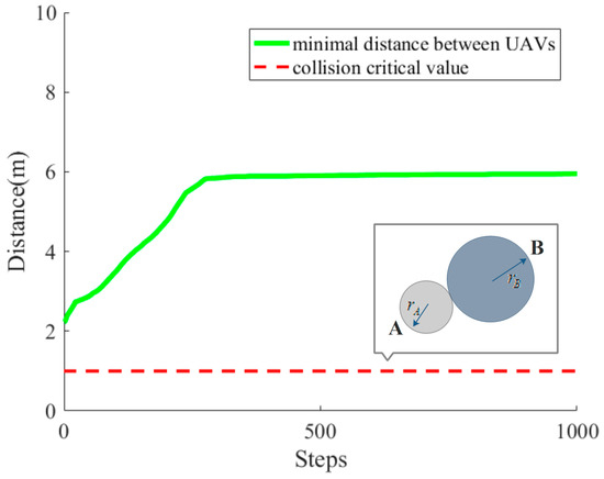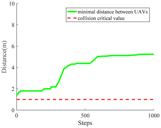 During the movement of UAVs, collisions with other UAVs and with obstacles are avoided. If the minimal distance between two UAVs is greater than the collision critical value (the sum of two UAVs’ shape radii), then the collision between these two UAVs would occur at that moment. In Figure 15, the minimum distance between UAVs (green thick line) and the collision critical value (red thin dashed line) in each simulation step are shown, demonstrating the effectiveness of averting collision with other UAVs intuitively.