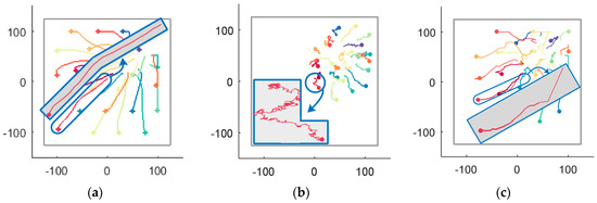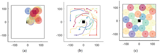 A case in a closed environment without obstacles is shown in Figure 12. First, UAVs are randomly distributed in crowded region , as shown in Figure 12a. Thus, according to UAVs’ local information, they begin to disperse to improve coverage without collision. The UAVs’ moving trajectories are recorded in Figure 12b, where the smoothness of the trajectories is noticeable. The algorithm is convergent when simulation step , and the optimal coverage position of each UAV is shown in Figure 12c.