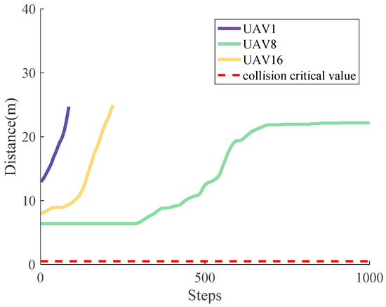 In Figure 16, the distance between the UAVs and obstacle is shown only when the obstacle is within the range of the UAV, demonstrating the effectiveness of averting collision with an obstacle intuitively. In this case, only UAV 1, UAV 8 and UAV 16 are assumed to consider the obstacle, while other UAVs only require consideration of their neighboring UAVs and the boundary of .