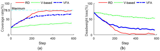 Next, the comparison of the coverage rate and deadweight loss among the RD, V-based and VFA methods are exhibited in Figure 19a,b respectively, which shows that the RD method has a higher coverage rate and less deadweight loss than the other two methods at the same time. The advantage of RD in coverage rate and deadweight loss also owes to its consideration of the UAVs’ reciprocity.
