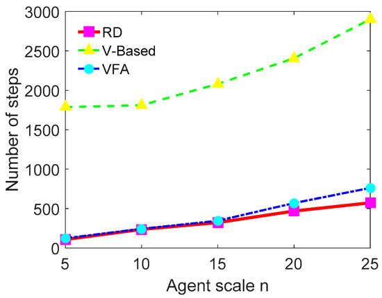 With the increasing scale of UAVs, the difference in convergence speed among these three methods is shown in Figure 20, which indicates that the RD method is more scalable and adaptable than the other two methods.