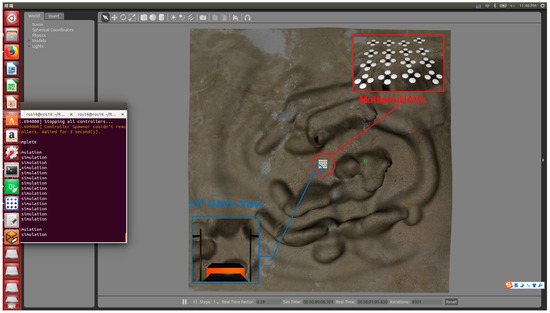 Limited by PC’s performance, a mimitype multi-UAV sensing coverage is customized, where 16 UAVs execute a cooperative coverage of mountainous region. The region is an area of 16,384 square meters, whose both length and width are 128 m. Each UAV flies at 50-m height with a maximum velocity of 20 m/s and sensing scope of . In addition, each UAV is instantiated as an independent ROS node, which means that the simulation is running in a distributed way. The printscreen of simulation on Gazebo is exhibited in Figure 22.