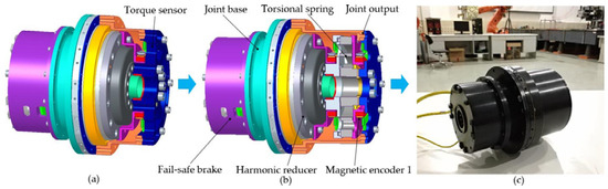 Robots, especially those working in industrial environments, have been generally designed according to the principle “rigidity by design, safety by sensors and control”. The safety to interact with rigid environments is usually guaranteed by means of active compliance control, i.e., position/force or impedance/admittance control [1,2,3]. However, the delays existing in the software system make the rigid actuator unsafe during sudden impacts and is incapable of handling contact transients. To overcome these difficulties, series elastic actuators (SEA) are proposed as a simple and effective solution to realize inherent compliance [4]. Unlike a rigid actuator, a SEA contains an elastic element in series, which introduces low mechanical output impedance, passive mechanical energy storage, and increases peak power output. Moreover, the inherent compliance brought by the elastic element can filter impact, protect drivetrains, and provide additional time for active controllers to regulate the impedance of the actuator.