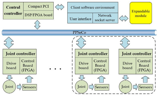 In this section, an expandable electrical system architecture is proposed as shown in Figure 2. The dashed part represents other joints, which can together constitute a humanoid manipulator. The electrical system adopts double-layer control structure, which mainly consists of a central controller and a joint controller. Some key factors of this scheme are taken into account. First of all, the double-layer control structure can reduce the computational burden and simplify system maintenance compared to a single controller. Another reason for the choice of double-layer control structure is that it facilitates building a humanoid manipulator in the future.