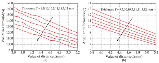 Results of the methodology adopted. The arrows indicate the direction of increasing spring thickness. (a) Geometry parameter L vs. Von Mises stress; (b) Geometry parameter L vs. Angular deformation of the spring.