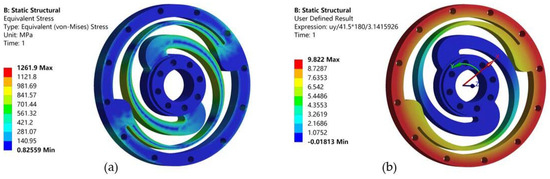 Analysis results of spring by FEM. (a) Static simulation for stress distribution; (b) Static simulation for angular deformation.
