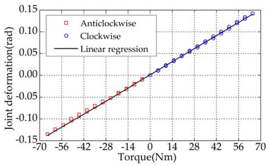 Actual stiffness of the designed spring should be calibrated. In this paper, it can be achieved by measuring joint stiffness by virtue of loading experiments. Loading and unloading are implemented on the flange which is mounted on the joint output. The torque exerted on the joint output can be calculated. Figure 6 shows that the calculated torque and the corresponding angular deformation of the elastic joint measured by the magnetic encoder 1. As shown in Figure 6, there is little hysteresis with loading and unloading on the joint. A linear regression was performed in both directions and the corresponding value of the joint stiffness can be calculated as 464.2 Nm/rad. The value of the joint stiffness, experimentally determined, is approximately 32.6% larger than the spring stiffness obtained by finite element analysis. This discrepancy probably arises in the imperfection of model used in the analysis and the different properties between the actual material after thermal treatment and the nominal counterparts. Besides, measurement errors of the sensor, the load and the arm may have a great influence on the experimental results.