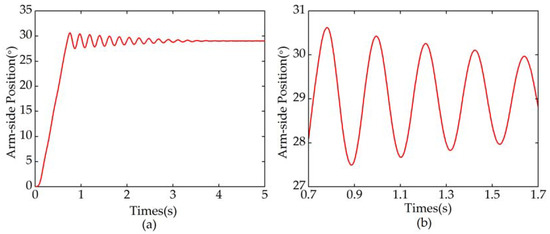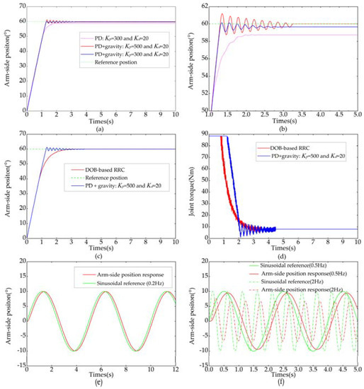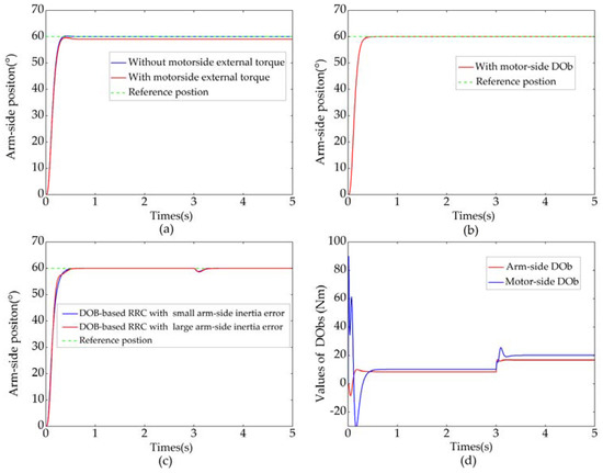 Figure 13a–d shows the simulation results of position control when a step reference input () was applied. If the arm-side disturbance was neglected, the position RRC without motor-side DOb is shown in Figure 13a. Due to large and small motor-side disturbance, there was almost no discrepancy between and . It is noteworthy that arm-side position responded rapidly, but there was a small overshoot. If external torque of 20 Nm was deliberately applied to the motor side, the steady-state error appeared. As it is shown in Figure 13b, the steady-state error caused by motor-side disturbance can be eliminated by virtue of the proposed motor-side DOb. It is clear from the figure that the motor-side DOb improved not only the steady-state performance but also the transient response of the system. Figure 13c shows the result of position RRC with DObs. An arm-side external torque of 10 Nm was applied at 3 s. After a short adjustment period, the arm-side position then kept following the step reference input quickly and smoothly. The robustness of the system was improved by using the arm-side DOb. Moreover, the proposed DOb-based RRC was robust against much larger disturbance on the nominal model, as shown in Figure 13c. The outputs of the arm-side DOb and motor-side DOb are shown in Figure 13d. Besides system uncertainties such as model variation, friction, and load, the estimated value of the arm-side disturbance contained external torque. Figure 13a–c clearly shows that the vibration can be suppressed by using the proposed RRC method. Simulation results show the validity of the DOb-based RRC.
