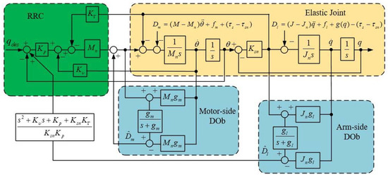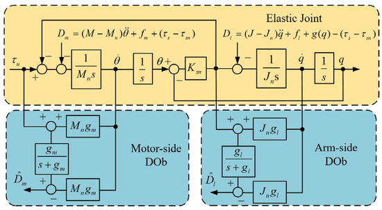 Robustness is essential to design a high-performance motion control system in practice. A DOb. which estimates external disturbances and system uncertainties, such as external load, friction, and inertia variation is widely used to achieve the robustness of motion control systems due to its simplicity and efficiency [34,35]. In this paper, a motor-side DOb and an arm-side DOb are both employed, as shown in Figure 9. Here, the disturbance torques on the motor side and arm side are defined in Equations (8) and (9), respectively. The outputs of the DObs, which can be described as the following two equations, are the estimation values of external disturbance: