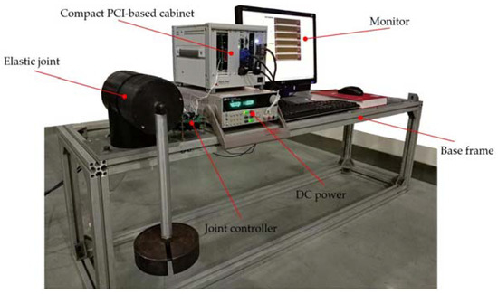 Secondly, to validate the performance of the modular elastic joint and the DOb-based RRC, an experimental platform was established as shown in Figure 14. This platform mainly consisted of six parts, i.e., base frame, elastic joint with load, joint controller, Compact PCI-based cabinet, DC power and monitor. An input link of the elastic joint was fixed on the base frame and an output one held the load. All the actual parameters of the elastic joint were obtained by corresponding calibration experiments and listed in Table 1. From Table 1, it can be concluded that the designed elastic joint basically meets the design requirements.