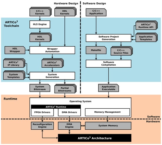 The ARTICo3 architecture provides a good starting point for edge computing in CPSs. However, FPGA-based systems, especially when enhanced by DPR, have been traditionally restricted to Academia due to their inherent complexity at both design and run time. To make the design of ARTICo3-based systems accessible to wider range of embedded system designers, an automated toolchain has been developed with two main objectives: on the one hand, to encapsulate user-defined hardware accelerators in a standard wrapper and automatically glue them to the rest of the hardware system; and, on the other hand, to generate the required binaries for software and hardware execution. Note that the hardware/software partitioning of the application is a step that needs to be done beforehand, either manually or using an automated tool. The ARTICo3 toolchain assumes independent hardware and software descriptions are provided as inputs. The components to enable a transparent use of ARTICo3 at run time, which are also required to make the framework accessible, are covered in the next section.