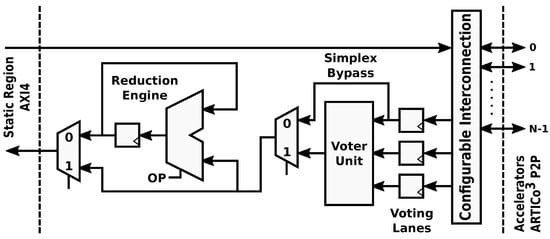 The redundant transaction mode (Figure 5) is used to enforce fault-tolerant execution, taking advantage of Double or Triple Module Redundancy (DMR and TMR, respectively). Hence, two or three copies of a given accelerator must be present for this mode to be applied. In this mode, burst-based write transactions are issued using a multicast scheme: all the accelerator copies get the same data strictly in parallel. Once the processing is done, a burst-based read transaction is issued, retrieving data also in parallel from all accelerators through a voter unit that decides which result is correct. This unit modifies its behavior according to the required fault-tolerance level, acting as a bypass for compatibility with the parallel mode (i.e., Simplex, no redundancy), a comparator in DMR, and a majority voter in TMR. Notice that the proposed scheme only ensures fault tolerance in the reconfigurable region. The rest of the system, including the Data Shuffler (which can be considered as a single point of failure), is assumed to have been previously hardened, if required, using additional fault tolerance techniques (e.g., configuration memory scrubbers [43]) that are out of the scope of this paper.