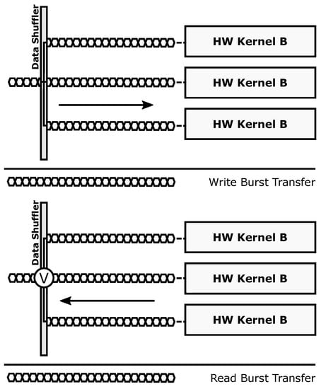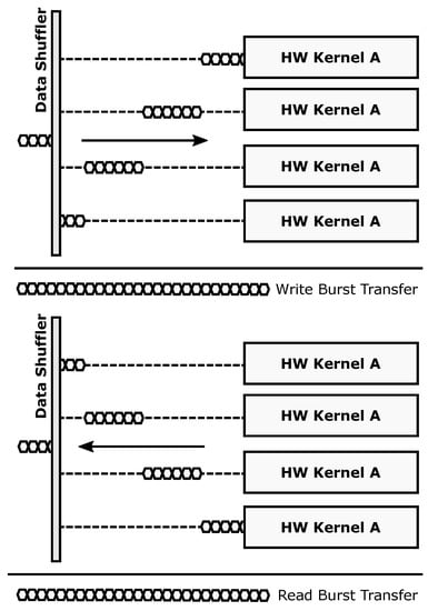 The communication infrastructure of ARTICo3, optimized for the hierarchical memory approach of the architecture, uses two standard interconnections, one for control purposes (register-based with AXI4-Lite protocol) and another fully dedicated to move data using a burst-capable DMA engine (memory-mapped with AXI4-Full protocol). A gateway module called Data Shuffler acts as a bridge between the twofold bus-based approach of the static region and the reconfigurable hardware accelerators, supporting efficient data transfers between both domains. This bridging functionality is used to mask custom point-to-point (P2P) communication channels behind standard communication interfaces (AXI4 slaves) that can be accessed by any element in the static region (e.g., the host microprocessor for configuration/control purposes, or the master DMA engine for data transfers between external memory and accelerators). This communication infrastructure constrains data transactions between external memory and local accelerator memories to be burst-based and memory-mapped. Application-specific data access patterns can still be implemented, but need to be managed explicitly either in software (the host application prefetches and orders data in the DMA buffers) or in hardware (the user-defined accelerator logic accesses its local memories with the specific pattern, providing additional buffer descriptions as required).