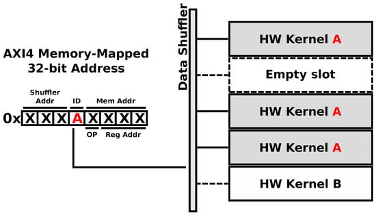 The true power of the ARTICo3 architecture resides in the method used to access the reconfigurable hardware accelerators, use the different transaction modes and take advantage of the embedded add-on modules (voter unit and reduction engine): the addressing scheme (shown in Figure 7). Taking advantage of the memory-mapped nature of the static region, hardware accelerators are addressed using a unique identifier, which is inserted in the AXI4 destination address for write transactions or in the AXI4 source address for read transactions. Therefore, addressing is made independent of the relative position of a given accelerator in the dynamic region, since it uses virtual sub-address ranges within the global map of the Data Shuffler to address hardware accelerators. Virtual sub-mappings are transparently managed by the framework, making kernel design agnostic from this process. As a consequence of this smart addressing scheme, the system can support user-driven task migration without compromising execution integrity in case a reconfigurable slot presents permanent faults (e.g., on-board processing in a satellite might suffer from severe radiation effects). Moreover, the proposed addressing scheme is also used to encode specific operations as part of the transaction addresses. For instance, the destination address in write transactions provides support for multicast commands (e.g., reset all accelerators with a given identifier), whereas the source address in read transactions can be used to encode the operator which is to be used when the reduction mode is enabled.
