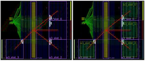 As a result, the toolchain produces output binaries for both hardware and software components without user intervention. This automated methodology greatly increases productivity by reducing development time and error occurrences, especially when compared to legacy design methodologies that were mainly handmade. For example, Figure 9 and Figure 10 show ARTICo3-based systems in two different devices that were manually generated and routed using legacy Xilinx tools (ISE), whereas Figure 11 shows the outcome of the toolchain (which uses current Xilinx Vivado tools) for another device. Although they are functionally equivalent, development time went down, on average, from almost a week to a couple of hours (these figures are based on the authors’ experience on designing reconfigurable systems). The main reason for this is that low-level technology and device dependencies are transparently handled by the toolchain, hiding them from the developer, who can now implement DPR-enabled systems with no extra effort.