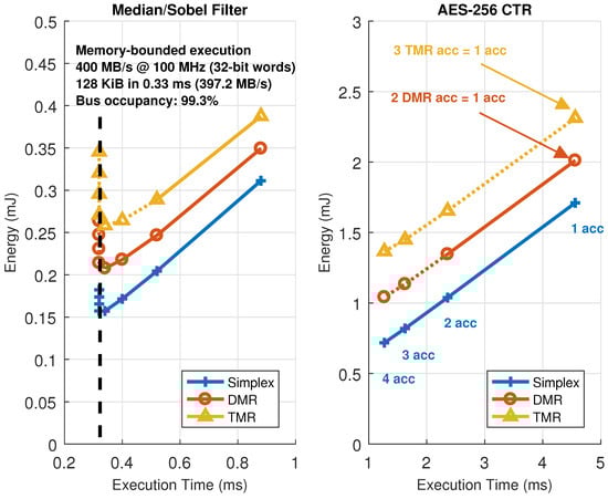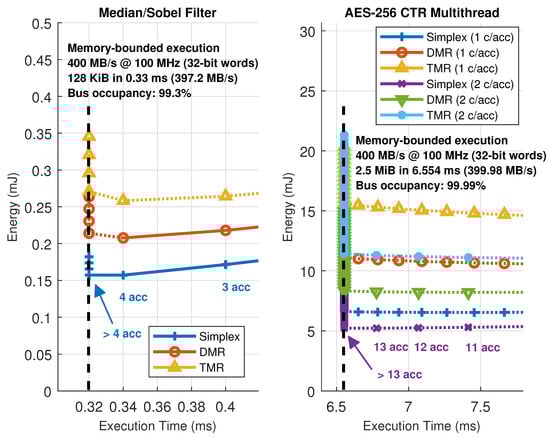 Figure 12 represents all the possible combinations in number of accelerators and their configuration, which are the parameters that need to be changed to move the working point of the architecture, for the image filtering and encryption accelerators in the HiReCookie node. From these results, it is clear that the image filters show a memory-bounded execution profile, saturating the available bandwidth in the dedicated data bus to almost full occupancy (99.3% of the theoretical maximum). Furthermore, this confirms that, whenever a kernel enters in memory-bounded execution, adding more accelerators to the architecture moves the working point to a worse scenario (more energy is consumed by just having the extra accelerator loaded, but execution performance cannot be increased), thus making working points close to that limit the optimal ones. The block cipher accelerators, on the other hand, always show a computing-bounded execution profile, since no saturation can be observed, and the system can move to better working points by increasing the number of accelerators (less time, and less energy consumption). Two additional comments have to be made regarding these results: the size of the accelerators is not the same (image filters use one slot, whereas the block cipher uses two), and the dotted lines represent solutions that have been estimated using models and kernel profiling using self-measurements [46] because their implementation is not feasible (there are not enough slots to allocate that many accelerators). The estimation process uses run-time measurements during a dummy execution of a given kernel to feed a parametric model and then predict the evolution of the working point of the architecture.