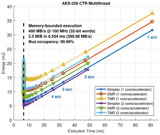 Finally, Figure 14 shows a closeup capture of the memory-bounded configurations in each setup. As mentioned above, execution time stalls when reaching a given number of hardware accelerators. However, this situation is not likely to happen for computing-intensive kernels (which in turn are the main target for ARTICo3 acceleration). This can be seen in the AES-256 CTR solution space, where the saturation point is far from the maximum feasibility point (i.e., the maximum number of reconfigurable slots), being all memory-bounded points just theoretical estimations obtained with the model.