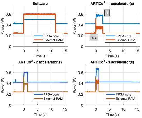The custom Zynq board has support for measuring power consumption using an external ADC connected to two power rails: Zynq core supply and external RAM supply, and hence, the results presented in this section have been measured using the infrastructure available in the board. Table 7 shows the performance metrics (self-measured using the embedded PMCs) when executing the application scenario in software and in ARTICo3, changing the number of accelerators used for processing. Even if the time spent reconfiguring the FPGA to load the accelerators is taken into account, the hardware-based implementations are always better than the software-based counterpart. Figure 15, on the other hand, shows the power consumption traces during application execution, also when using software- and hardware-based processing with a variable number of ARTICo3 accelerators. For the hardware solutions, the measured profile has an initial stage where the FPGA is fully reconfigured to load the bitstream with the static part (i.e., full reconfiguration), a second stage where DPR is used to load as many accelerators as required (i.e., partial reconfiguration, where only the slots are reconfigured), and a third one in which the matrix multiplication is done using ARTICo3. Again, note that, even if reconfiguration times are taken into account, the hardware-based solution is still better than the software-based one.