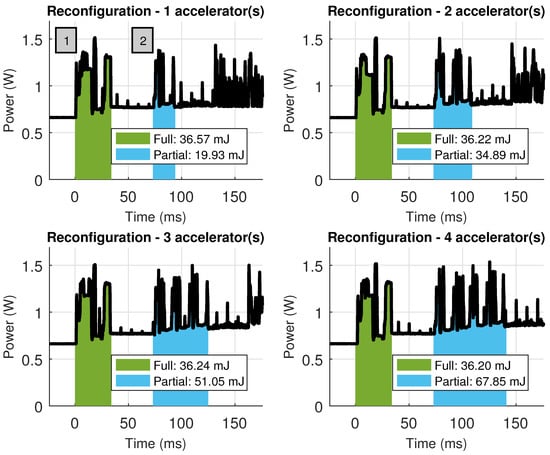 Due to the large difference in elapsed times between hardware and software, it is hard to appreciate the reconfiguration stages in detail. Notice that this is the desired scenario, with negligible reconfiguration times when compared with processing times. Nevertheless, Figure 16 shows a close up of both reconfiguration processes, where it is possible to see not only the time spent in these processes but also the energy consumed. Since reconfiguration is performed using the PCAP (Processor Configuration Access Port) available in Zynq devices, which is a DMA-powered reconfiguration engine, loading large bitstreams is less time consuming than loading smaller, partial bitstreams into the FPGA (one reconfiguration command and its associated DMA transaction are issued per partial bitstream). This can be seen in the scenario where four accelerators are loaded (bottom right), spending also more energy during the process than the energy spent during full FPGA reconfiguration.