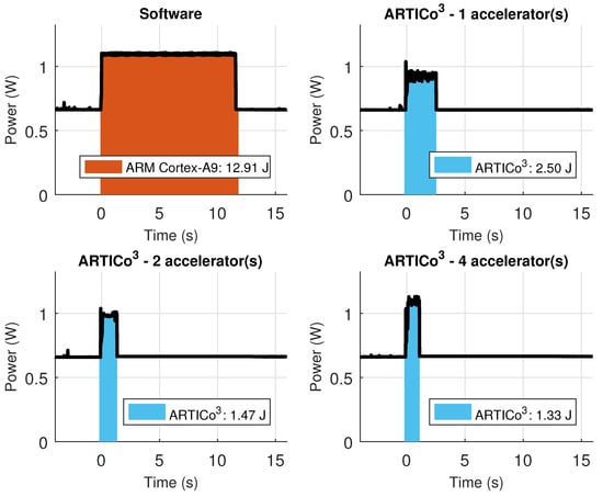 However, having higher power consumption values is not bad per se, since it can then lead to faster processing times and, therefore, less energy consumption during the hardware-based processing stages (provided that the algorithm or application is highly intensive in terms of computing requirements). This scenario can be seen in Figure 17, where the energy spent by the example application is measured in four different scenarios (only software, and ARTICo3 with one, two or four accelerators). Notice that the measured values for hardware-based computing also include the energy spent during full and partial reconfiguration, proving that sometimes it is beneficial to use more accelerators than originally intended, provided that the working point has been set close to the computing-bounded region of the solution space. Under these circumstances, it is possible to achieve a reduction of 9.5 times in terms of energy, achieving also a speed up of 13.05 times in terms of execution performance.