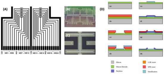 The chip was designed to bear 24 equivalent 50 µm equivalent Pt disc electrodes. The electrodes are positioned in groups of 12 around two reference electrodes in a manner which means they are all equidistant from and in an equivalent configuration with respect to the relevant reference electrode (see Figure 1A,B). Each interdigitated finger has been passivated with Parylene which was later etched to expose a 50 µm disc (see Figure 1C). The chip was produced following the process flow illustrated in Figure 1D. Firstly, a 1 µm thick layer of silicon dioxide was thermally grown to provide electrical isolation between the electrodes and underlying silicon carrier wafer (a). The conductive electrode layer was patterned using a lift-off process (b,c) and the electrodes themselves comprised a 150 nm layer of platinum upon a 5 nm adhesion layer of chrome (d). To ensure that only the desired electrode areas came into contact with the solution under test, a 1 µm layer of Parylene was deposited over the samples to act as a passivation layer (f). Contact holes were then opened in the Parylene to reveal only the electrodes and contact pads of the device. This was achieved by patterning of the wafer using standard photolithography (g), followed by reactive ion etching in oxygen plasma to reveal the electrode areas (h). Full details off the fabrication process are detailed elsewhere [28].