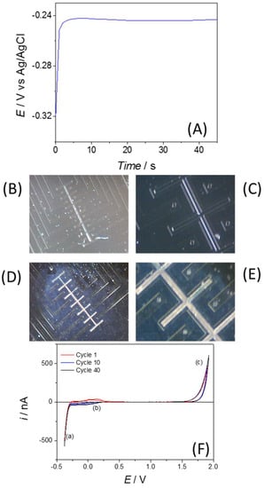 To obtain a silver/silver chloride reference electrode it was necessary to plate silver onto the platinum structure intended for use as reference electrode. Using a three electrode system (which consists of the on-chip platinum electrode to be plated, and external Ag/AgCl reference and platinum wire counter electrodes) and a degassed solution of 2.0 M potassium thiocyanate and 20 mM silver nitrate, chronopotentiometry was performed (Figure 2A shows the chronopotentiogram). This involved passing a current of −500 µA for 45 s. Once plated, exposure of the silver surface to 50 mM ferric chloride solution for 1 min [19], resulting in the complete functionalization to Ag/AgCl. Electrode structures can be seen in Figure 2B–E respectively.