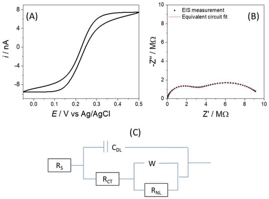 The impedimetric response was also typical of a microelectrode (Figure 3B); fitting to the established modified Randles’ equivalent circuit (Figure 3C), which includes a non-linear resistance in parallel with the Warburg impedance in order to model the hemispherical diffusion profile [28]. (EIS data is presented in the form of a Nyquist plot with each point representing a single frequency and points going from high to low frequency away from the origin). The red line in Figure 3B is the equivalent circuit fit, which produced values for CDL of 0.589 nF, RCT of 2.77 MΩ and RNL of 7.23 MΩ. The error associated with these fitted values ranged between 0.4 and 2%, confirming the goodness of fit.