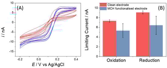 The microelectrodes were incubated with the short chain alkanethiol MCH using an established protocol [22]. The molecule forms self-assembled monolayers on platinum and gold surfaces and briefly, involved exposing the chip to a 30 µM MCH solution for 24 h with a final backfilling step of 1 h in 1.0 mM MCH solution. The formation of an alkane thiol layer is observed experimentally as an increased insulation of the electrode manifesting as a reduction in total current and an increase in impedance compared to clean electrodes. The cyclic voltammograms (Figure 4A) maintained a sigmoidal shape but showed reduced limiting currents due to a reduction in effective electrode radius due to presence of a chemical film on the surface. Figure 4B shows the mean limiting currents and standard deviations associated with the clean and functionalized electrodes. To summarize, IL for oxidation decreased from 7.35 to 5.31 nA with the S.D. increasing from 0.3 to 1.45 and for the reduction reaction the limiting current decreased from 9.07 nA to 6.41 nA with the S.D. increasing from 0.31 to 1.87. The decrease in limiting current is due to the formation of a blocking film, which reduces the effective area. Within the film there are pinholes which facilitate more rapid electron transfer reactions than areas bearing SAM. It is these sites which it has previously been suggested are more prevalent within SAMs formed on microelectrodes than macroelectrodes [29]. The increase in current variation as shown by increased S.D. for the limiting current reflects the irreproducibility associated with SAM formation on the electrode surface. Characterization of the electrodes as displayed in Figure 4A and reported in the S.D. associated with the limiting current showed the response to be highly consistent across the chip prior to chemical modification. These initial data recorded prior to MCH functionalization, with low inter electrode variation highlight the benefit of the microfabrication approach for microeletrode production and display similar errors to our previously published work which contrast with the higher errors typically observed from employing glass pulled microelectrodes to perform electroanalytical measurements [32].