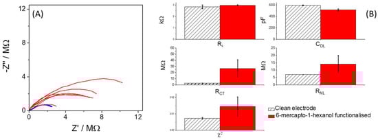 (A) EIS plots recorded in 2.5 mM ferri-ferrocyanide + 1 mM potassium chloride + 100 mM potassium nitrate. (B) Mean and Standard Deviations (Bars) associated with the parameters obtained from equivalent circuit fitting (RS, CDL, RCT, RNL and global χ2) for clean and chemically modified microelectrodes (n = 6), recorded in 1.0 mM ferri-ferrocyanide + 1 mM potassium chloride + 100 mM potassium nitrate. N = 6 and error bars represent standard deviation.