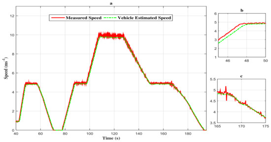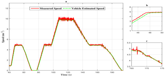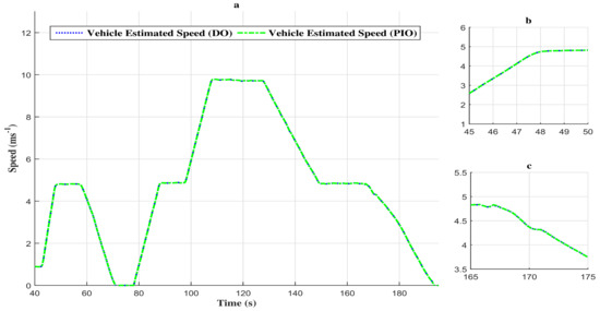 (a) Comparison of the vehicle estimated speed with the two observers. (b) Zoom in at ss]. (c) Zoom in at ss].