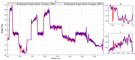 In fact, the estimated equivalent torque comparison between descriptor observer and proportional integral observer is depicted in Figure 11a. From this figure, we can note that the descriptor observer has a significant disturbance attenuation level compared to the proportional and integral observer. Further, we can notice that the abrupt additive fault variations affect the estimated equivalent torque, as shown in Figure 11b,c. Additionally, estimation error is very small with the proportional and integral observer and negligible with the descriptor observer.