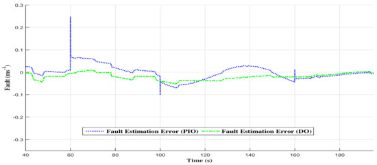 In fact, Figure 12 shows the comparison between the two observers fault estimations, and the Figure 13 shows the comparison of the fault estimation error. One can notice that the descriptor observer estimated fault state tracks the emulated one where the performances are good in dynamic, as well as in static output. On the other hand, the proportional and integral observer seems to present a small estimation error. This error is the consequence of the abrupt variations in the additive fault, and it is due to the proportional and integral observer scheme.