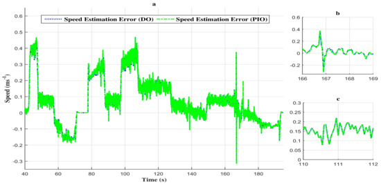 (a) Comparison of speed estimation error between the two observers. (b) Zoom in at ss]. (c) Zoom in at ss]