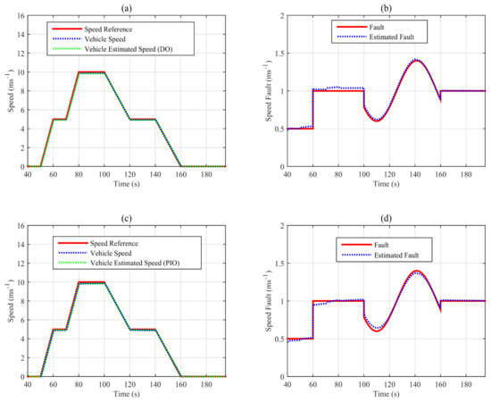 The difference between the descriptor observer and the proportional and integral observer in performing fault estimation is due to the nature of the last one. In fact, in a real-time environment, the numerical integration may not be achievable and lead to a highly time-consuming process, thus generating significant estimation errors. However, the vehicle speed estimation by the two observers presents no significant difference (see Figure 14a–c). Indeed, the speed estimation error comparison given in Figure 15 shows a negligible estimation error (around ms).