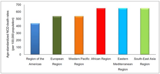 Heart diseases are considered a major public health problem, since they are the leading cause of death worldwide, especially in populations of large urban centers. According to data from the World Health Organization, 17.3 million people died in 2012 as victims of this type of disease. The estimate is that, by 2030, this number will be 23.6 million [9,10]. The statistical data of death by NTCDs separated by WHO region can be verified in Figure 1.