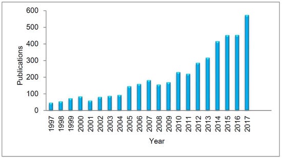 Comparative of 20 years (1997–2017) of PPG publications. Data were obtained from Web of Science using “photoplethysmography” as topic (accessed on 20 February 2018).