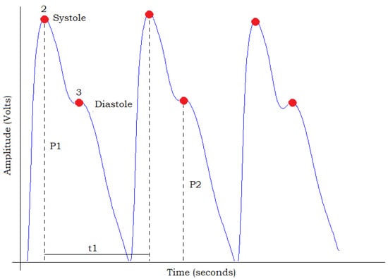 The increase in heart rate and pulse wave amplitude (P1), shown in Figure 3 with number 2, reflects the growth of blood flow in the signal due to contraction of the left ventricle of the heart. The amplitude of the dicrotic minimum, represented in Figure 3 with number 3, varies with arterial vascular elasticity and fundamentally depends on the interaction of the initial pressure wave, when the heart contracts, and with the pressure wave that is reflected due to peripheral arteries [15]. However, the points identified in Figure 3 may not be present in all PPG signals, since the waveform of the photoplethysmography signal changes significantly as a function of some conditions, such as body age, vascular age, physical status (regarding sleeping hours, physical activities, etc.) and others [15,28].