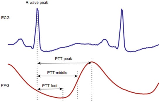 There are more recent methods, such as the “diastolic patch” technique where the two foot point regions of two waveforms are correlated to find the time difference between the times of arrival of these waveforms [38,41]. Furthermore, some important variables can be estimated using the PPG signal; one of them is the PTT (Pulse Transit Time). PPT is defined as the time the pulse propagates from the heart to a peripheral locale and has been proposed as a potential substitute of the calculation of the arterial pressure (AP). That is, the time required for the arterial pulse pressure wave to propagate from the aortic valve to a peripheral site (usually the finger) is considered. The PTT may be promptly derived from the electrocardiogram (ECG) or photoplethysmogram (PPG) [42,43,44]. The rigidity and the tension in the arterial walls are the fundamental causes that determine the speed of transmission of the pulse wave, and this, in turn, depends to a great extent on the blood pressure [42,43].