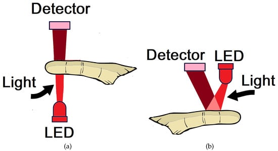 Representation of the operation of photoplethysmography sensors for finger application, by transmission (a) and by reflection (b). Adapted from [58].